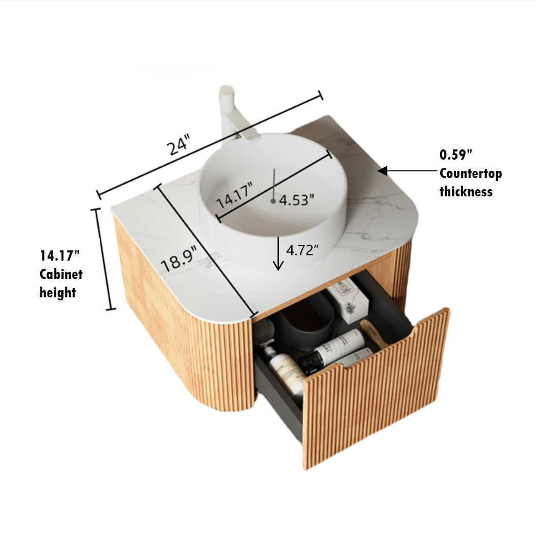 14 Inch glossy white round ceramic vessel sink above counter, with excellent durability and stain resistance, easy to maintain, standing up to long-term use. The basin designed with one standard size pre-drilled faucet hole,also came with a sink hole cover and an expandable sink drain pipe. This vanity tops is made of premium artificial marble, with excellent superior water resistance, moisture resistance and easy to maintain. The faucet mounting hole size is 1.38'', the height of faucet spout ≥9'' is recommended.